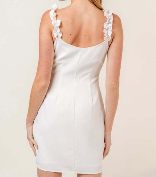 This chic body-con mini dress features delicate ruffled shoulder straps that add a touch of femininity to the sleek silhouette. Dress has invisible zipper. Fabric has little to no stretch. If in-between sizes, choose larger size.